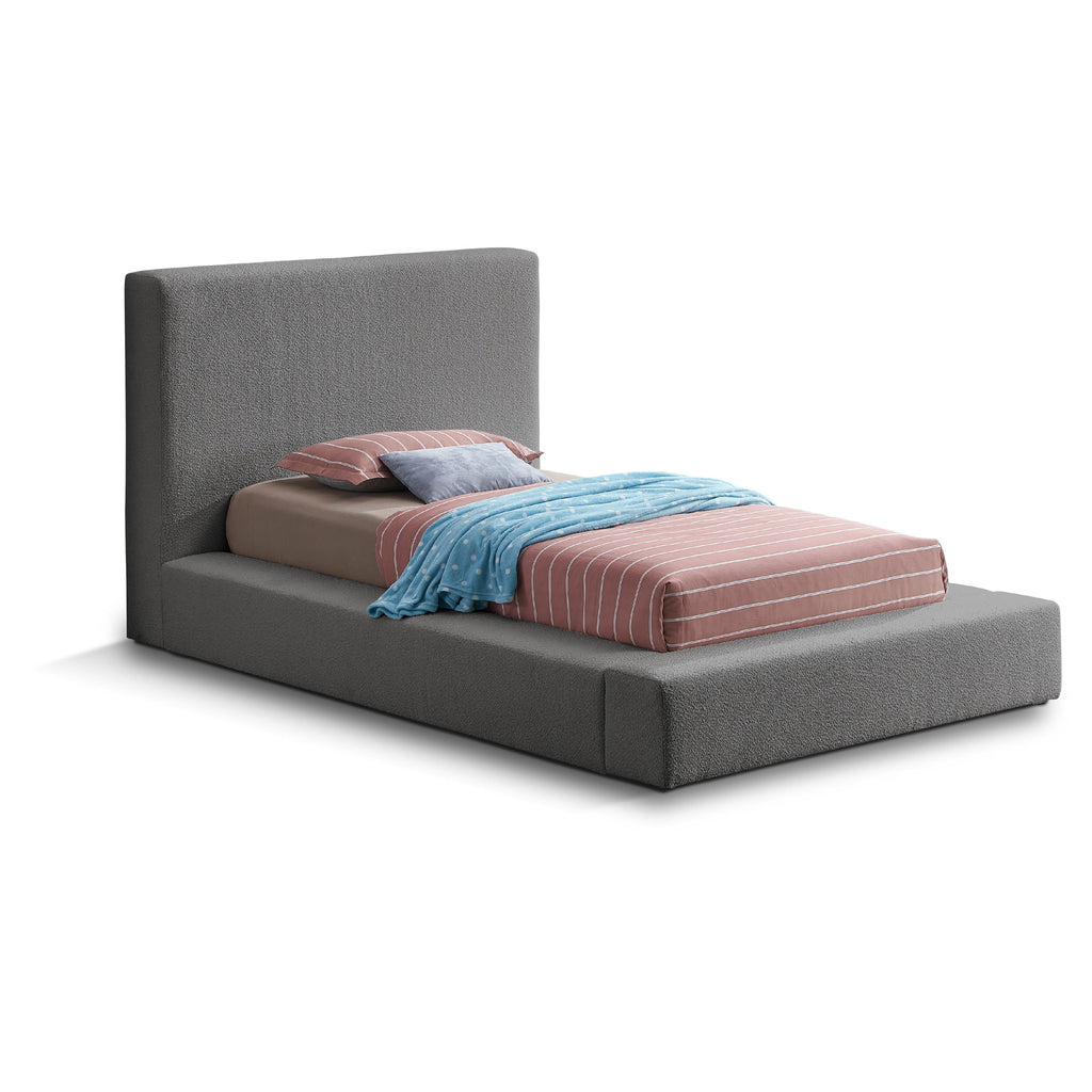 Go for an impressive new look in the bedroom with this Terra boucle fabric bed. This low-profile bed features a slightly high headboard along with thick side rails and footboard-all upholstered in rich grey boucle fabric for a luxe look you'll fall in love with. This contemporary bed is bound to cause a stir in the master suite or other bedroom where it instantly becomes the star of the show when paired with the furnishings of your choice.