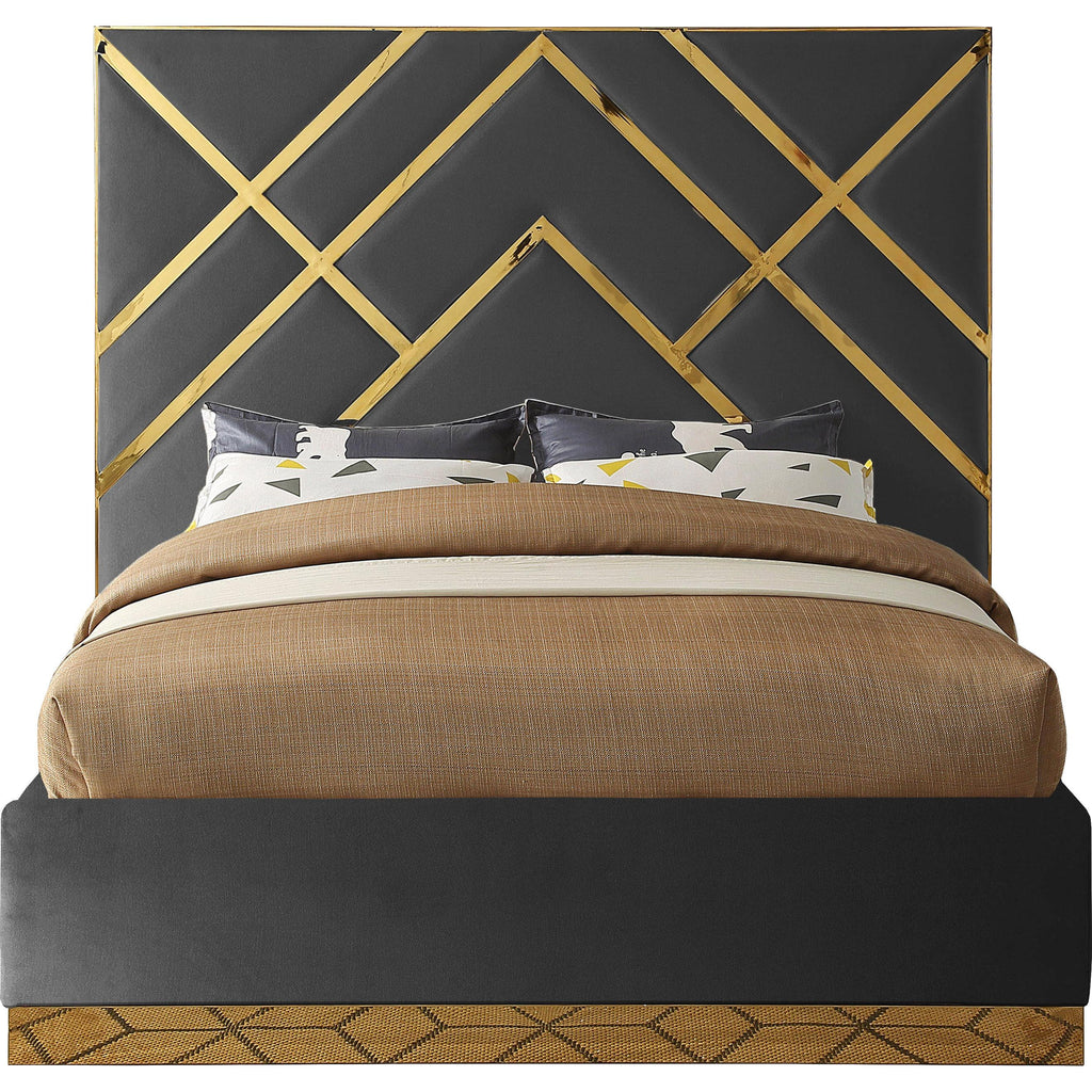 Take your bedroom space to a whole new modern level with this Vector grey velvet king bed. Posh velvet upholstery in a lovely grey color is intersected by polished gold metal in a geometric design that is nothing short of spectacular. This stunning bed has a gold metal base to finish off the presentation on a glamorous and upscale note. Full slats are included with the bed to help provide support for your mattress, and the platform footprint ensures you need no box springs or foundation to recreate this look at home.