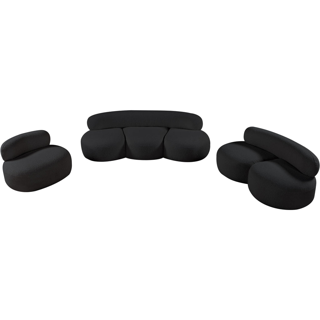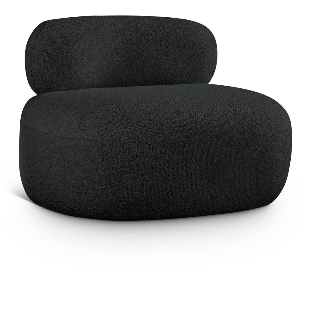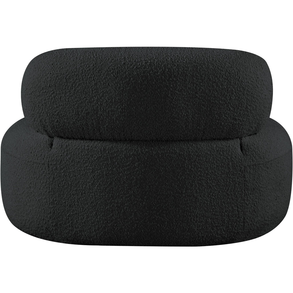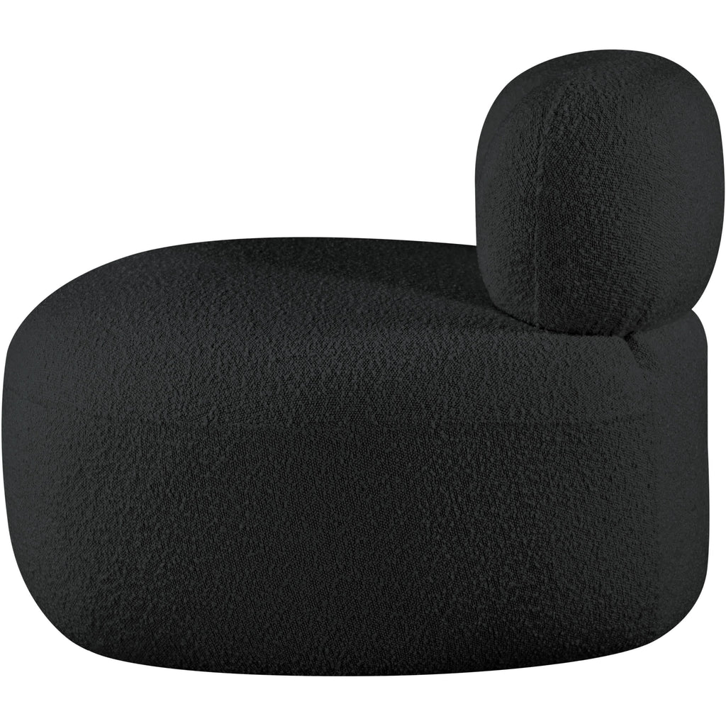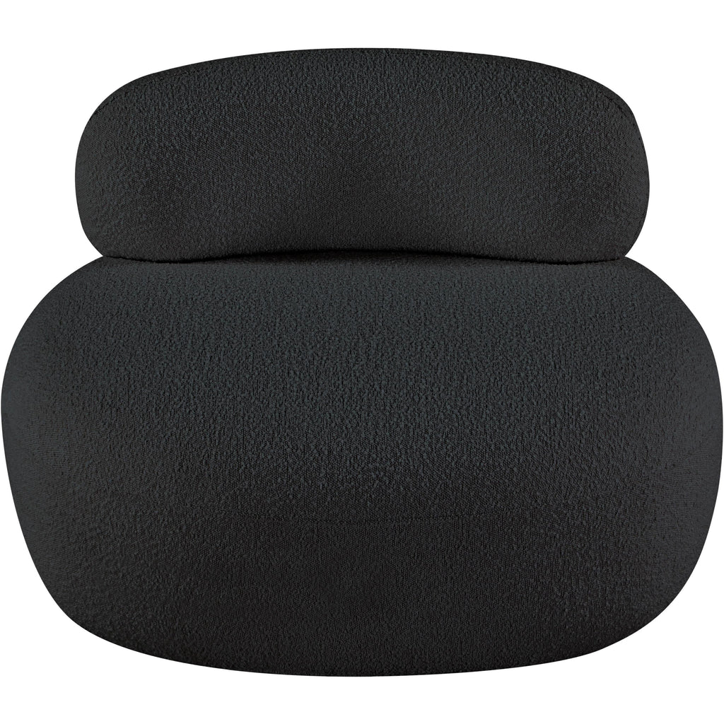 Discover timeless beauty with this Venti boucle fabric living room chair that's designed to elevate your interior space. This exceptionally crafted art-deco-inspired chair is part of the Venti collection and boasts an alluring curved shape to add elegance and refinement to your room. Upholstered in rich black boucle fabric, the chair has a plush texture that's oh-so-cozy against the skin. The art deco styling makes it a real statement piece, whether you place it in your living room, home office, or your favorite reading nook.