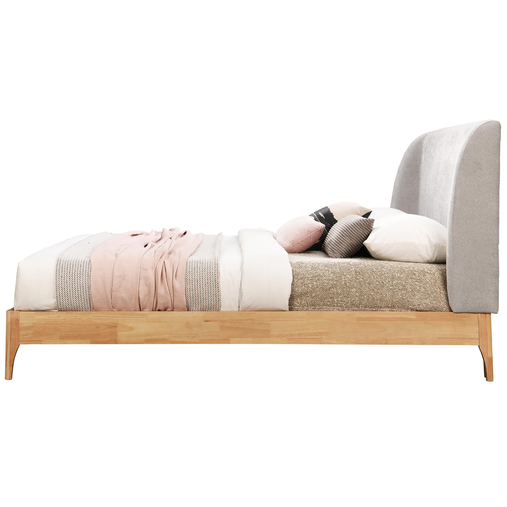 Bestow midcentury modern charm to your bedroom retreat with this lovely Ventura fabric bed. A winged headboard adds an elegant touch to the design of this handsome bed, and upholstery in a soft neutral grey color makes it easy to integrate the bed with other furnishings. Solid wood legs in a natural finish form a contrast that enhances the bed's overall aesthetic. This is a full-slatted bed, so use it with or without a box spring as desired.
