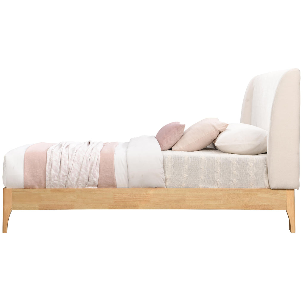 Bestow midcentury modern charm to your bedroom retreat with this lovely Ventura fabric bed. A winged headboard adds an elegant touch to the design of this handsome bed, and upholstery in a soft neutral cream color makes it easy to integrate the bed with other furnishings. Solid wood legs in a natural finish form a contrast that enhances the bed's overall aesthetic. This is a twin-slatted bed, so use it with or without a box spring as desired.