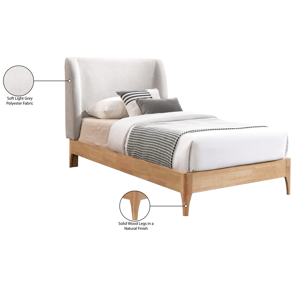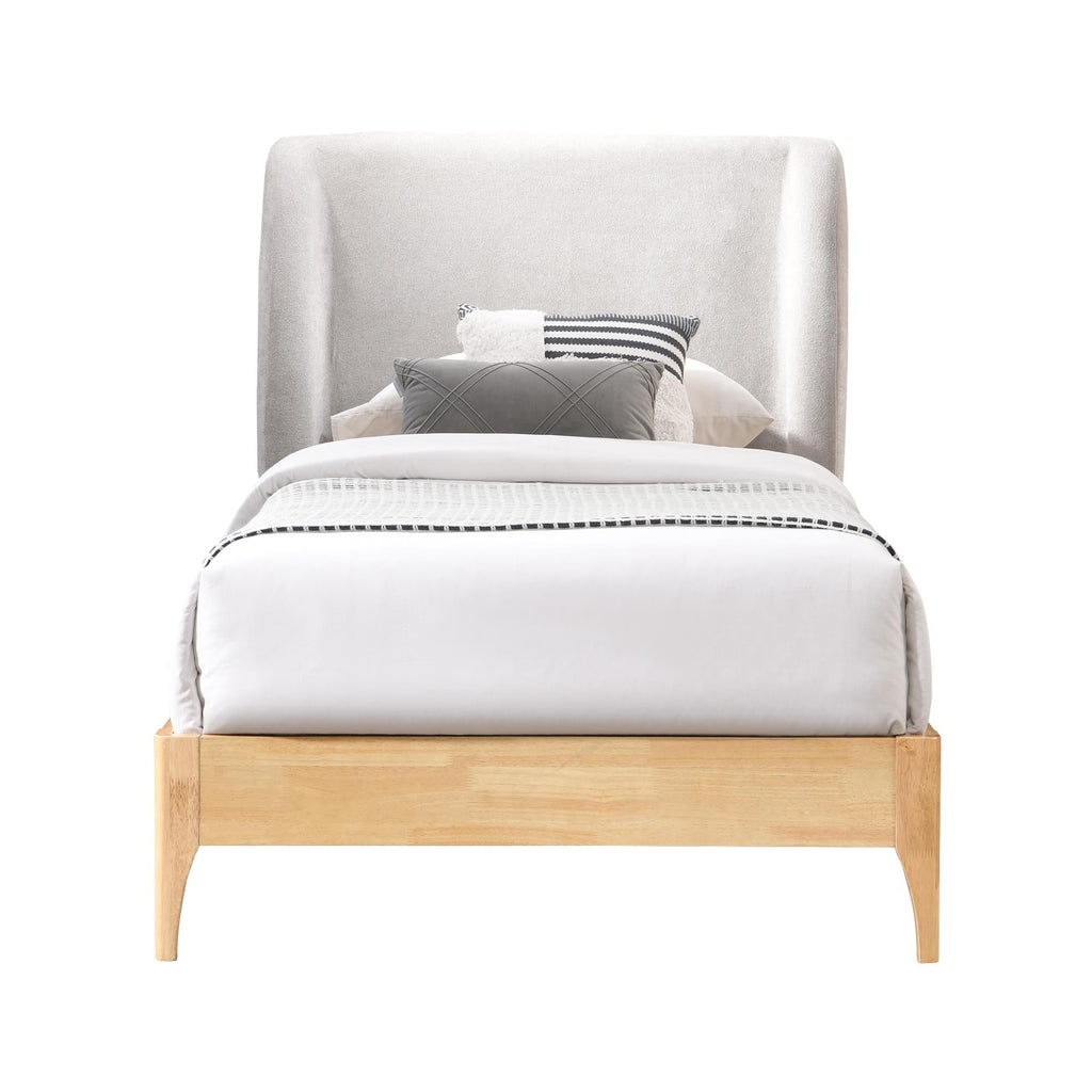 Bestow midcentury modern charm to your bedroom retreat with this lovely Ventura fabric bed. A winged headboard adds an elegant touch to the design of this handsome bed, and upholstery in a soft neutral grey color makes it easy to integrate the bed with other furnishings. Solid wood legs in a natural finish form a contrast that enhances the bed's overall aesthetic. This is a twin-slatted bed, so use it with or without a box spring as desired.