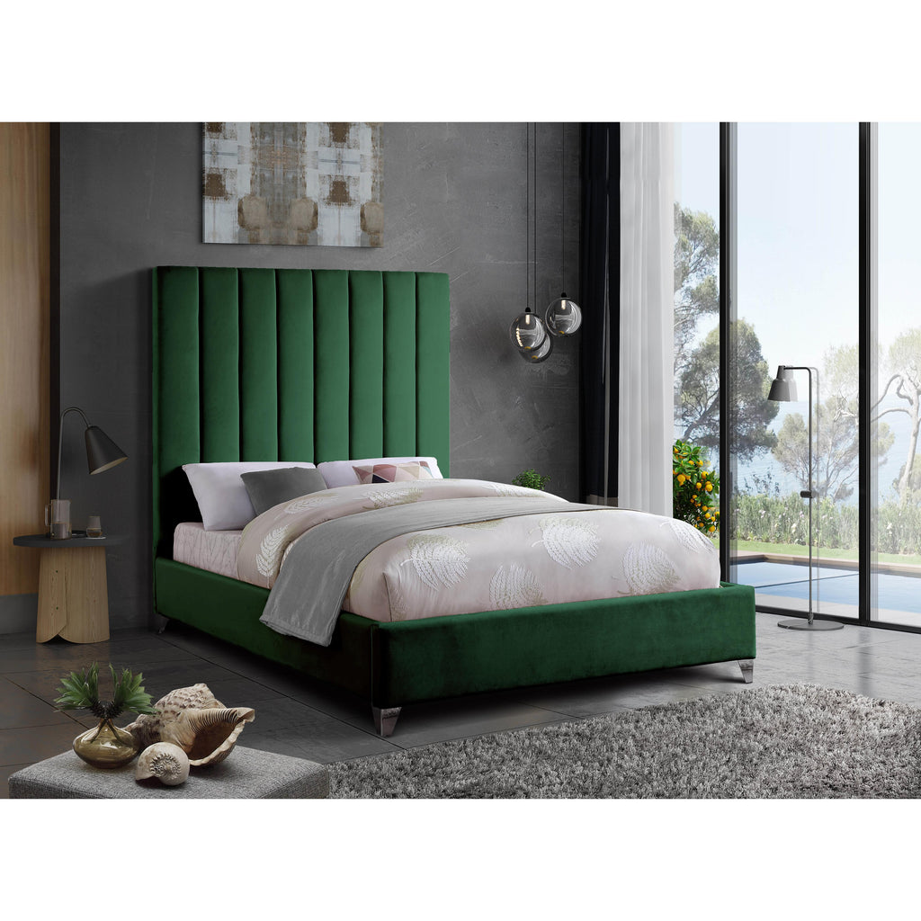 Take the look of your bedroom to new decorative heights with this ultra-modern Via upholstered full bed. Rich green velvet upholstery gives this bed a true upscale feel and epitomizes fine living while channel tufting along the headboard keeps the padded material inside plump and it also cradles your body while you sit up in bed to watch TV or read. Metal legs bring this platform bed up off the floor, allowing clearance below for cleaning and adding to its svelte contemporary profile.