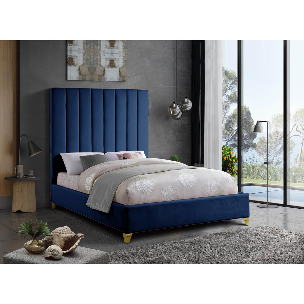 Take the look of your bedroom to new decorative heights with this ultra-modern Via upholstered king bed. Rich navy velvet upholstery gives this bed a true upscale feel and epitomizes fine living while channel tufting along the headboard keeps the padded material inside plump and it also cradles your body while you sit up in bed to watch TV or read. Metal legs bring this platform bed up off the floor, allowing clearance below for cleaning and adding to its svelte contemporary profile.