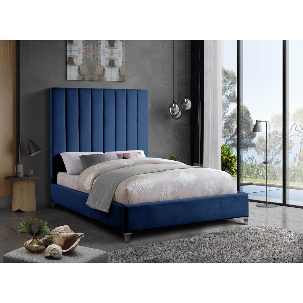 Take the look of your bedroom to new decorative heights with this ultra-modern Via upholstered queen bed. Rich navy velvet upholstery gives this bed a true upscale feel and epitomizes fine living while channel tufting along the headboard keeps the padded material inside plump and it also cradles your body while you sit up in bed to watch TV or read. Metal legs bring this platform bed up off the floor, allowing clearance below for cleaning and adding to its svelte contemporary profile.