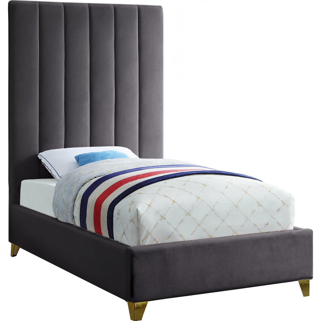 Take the look of your bedroom to new decorative heights with this ultra-modern Via upholstered twin bed. Rich grey velvet upholstery gives this bed a true upscale feel and epitomizes fine living while channel tufting along the headboard keeps the padded material inside plump and it also cradles your body while you sit up in bed to watch TV or read. Metal legs bring this platform bed up off the floor, allowing clearance below for cleaning and adding to its svelte contemporary profile.