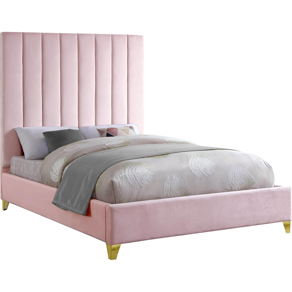 Take the look of your bedroom to new decorative heights with this ultra-modern Via upholstered twin bed. Rich pink velvet upholstery gives this bed a true upscale feel and epitomizes fine living while channel tufting along the headboard keeps the padded material inside plump and it also cradles your body while you sit up in bed to watch TV or read. Metal legs bring this platform bed up off the floor, allowing clearance below for cleaning and adding to its svelte contemporary profile.