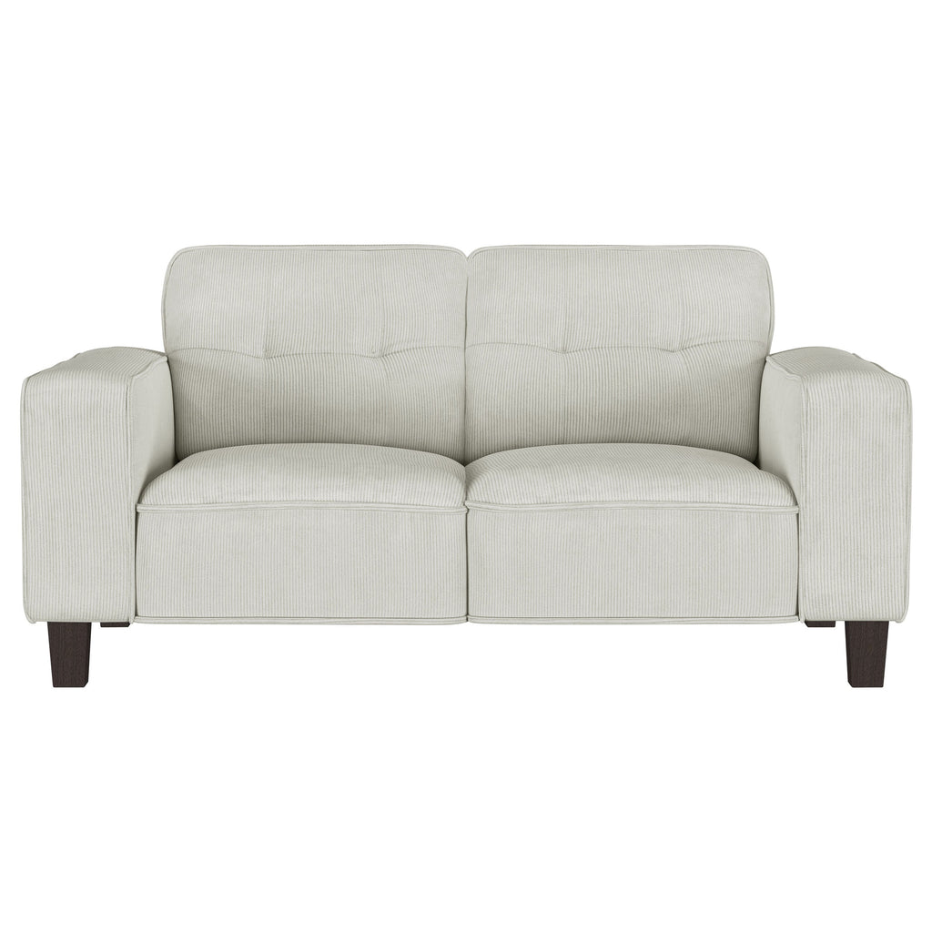 Infuse tailored elegance with the tufted details of a modern sofa set. Featuring a three-seat sofa and two-seat loveseat, this set offers a refined anchor for your living room seating. Smooth, soft upholstery adds neutral color, while plush foam and sinuous springs ensure optimal comfort. The sofa and loveseat each feature tufted back cushions, offering a refined touch of mid-century charm. Track arms define a straight, clean-lined silhouette that's simply timeless and each piece stands on dark brown finished tapered wooden legs that add airy height.