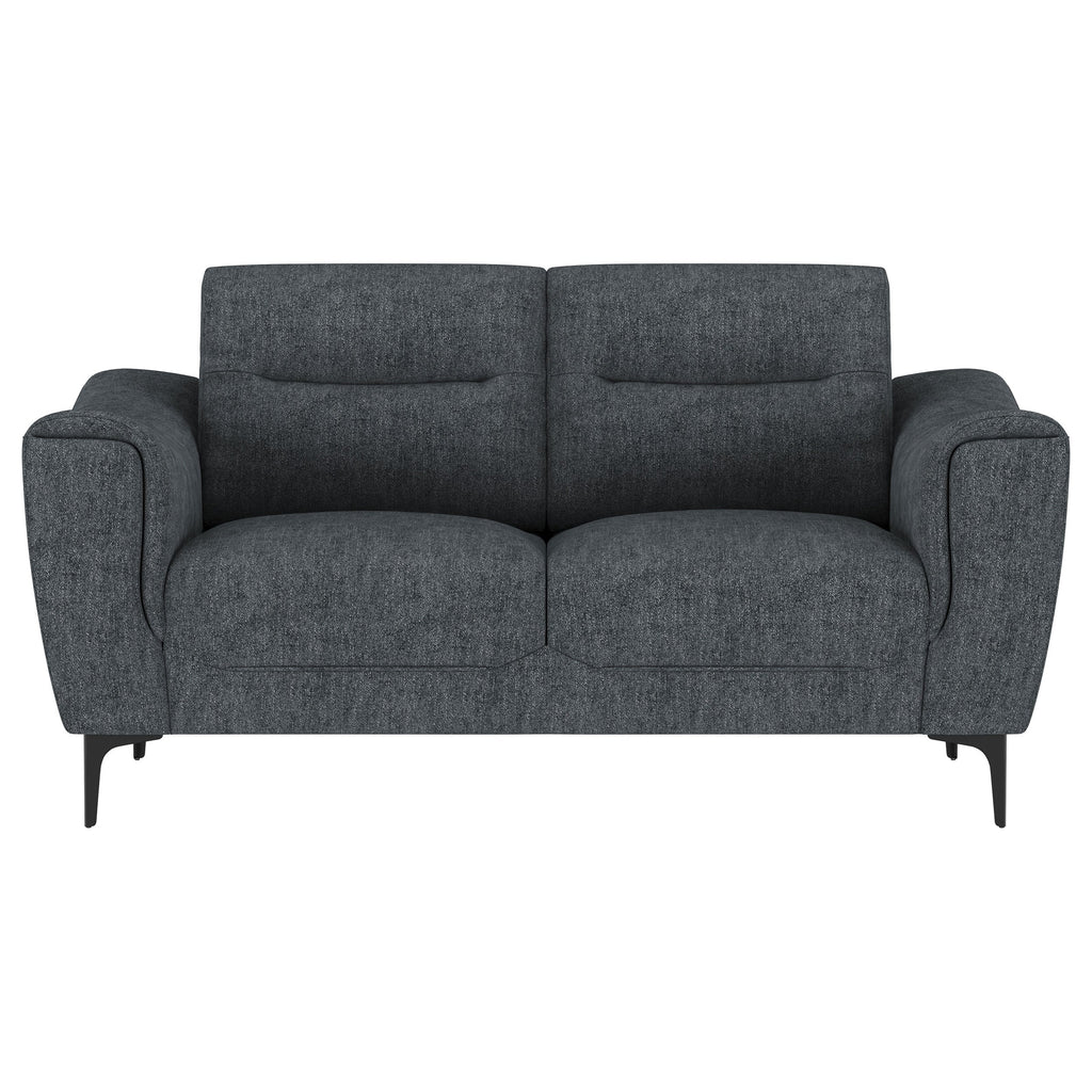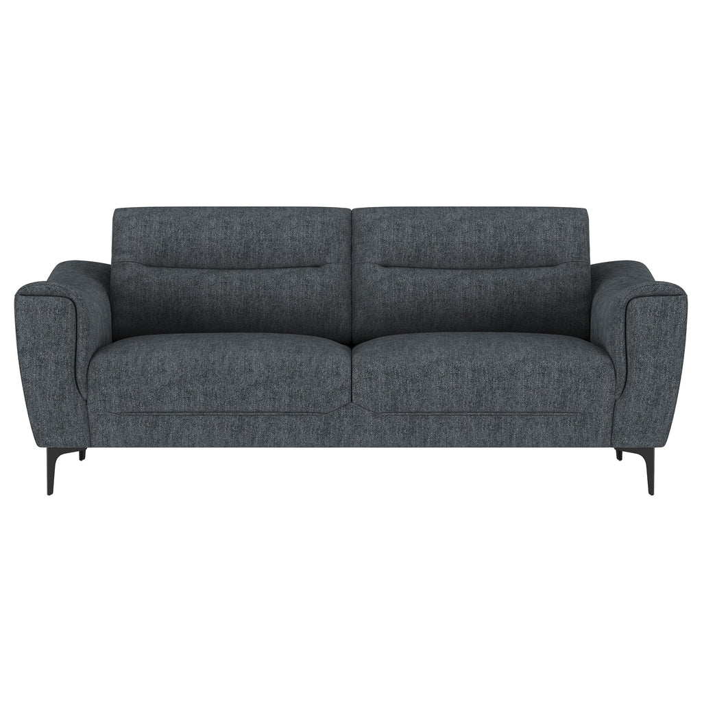 Indulge in effortless style and comfort with this chic transitional sofa set. Soft charcoal upholstery gracefully harmonizes with any dŽcor, while plush pocket coil seat cushions and modern track arms provide inviting support for your downtime. Designed with attached cushions for a neat appearance and innovative metal legs that allow for easy assembly, this collection elevates the overall ambiance of your living space.