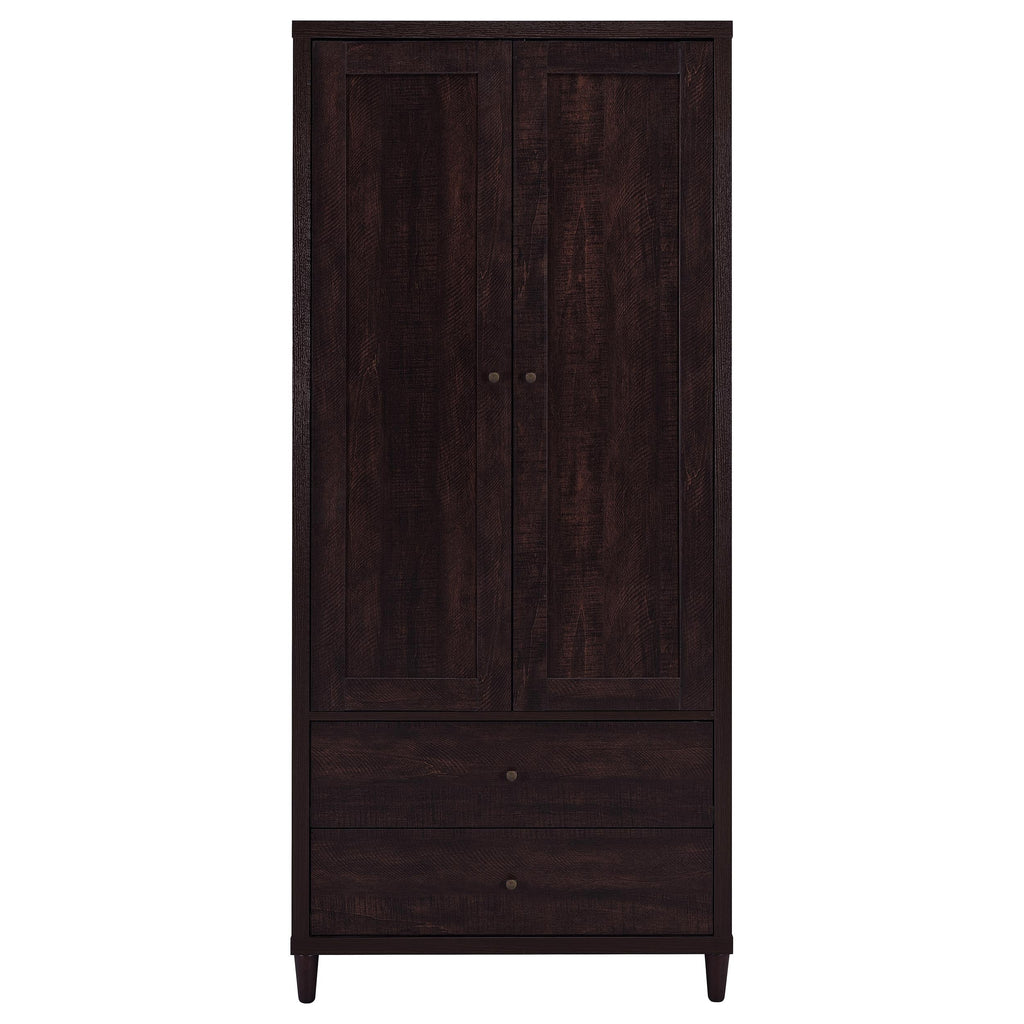 This impressive accent cabinet imparts an imposing presence to the home. At over six feet tall, it has the capacity to take on all storage needs. Two doors open up to ample space. Below are two deep drawers for additional storage of everything from sofa covers to extra plateware. The cabinet is finished in rustic tobacco for a warm, inviting ambiance.