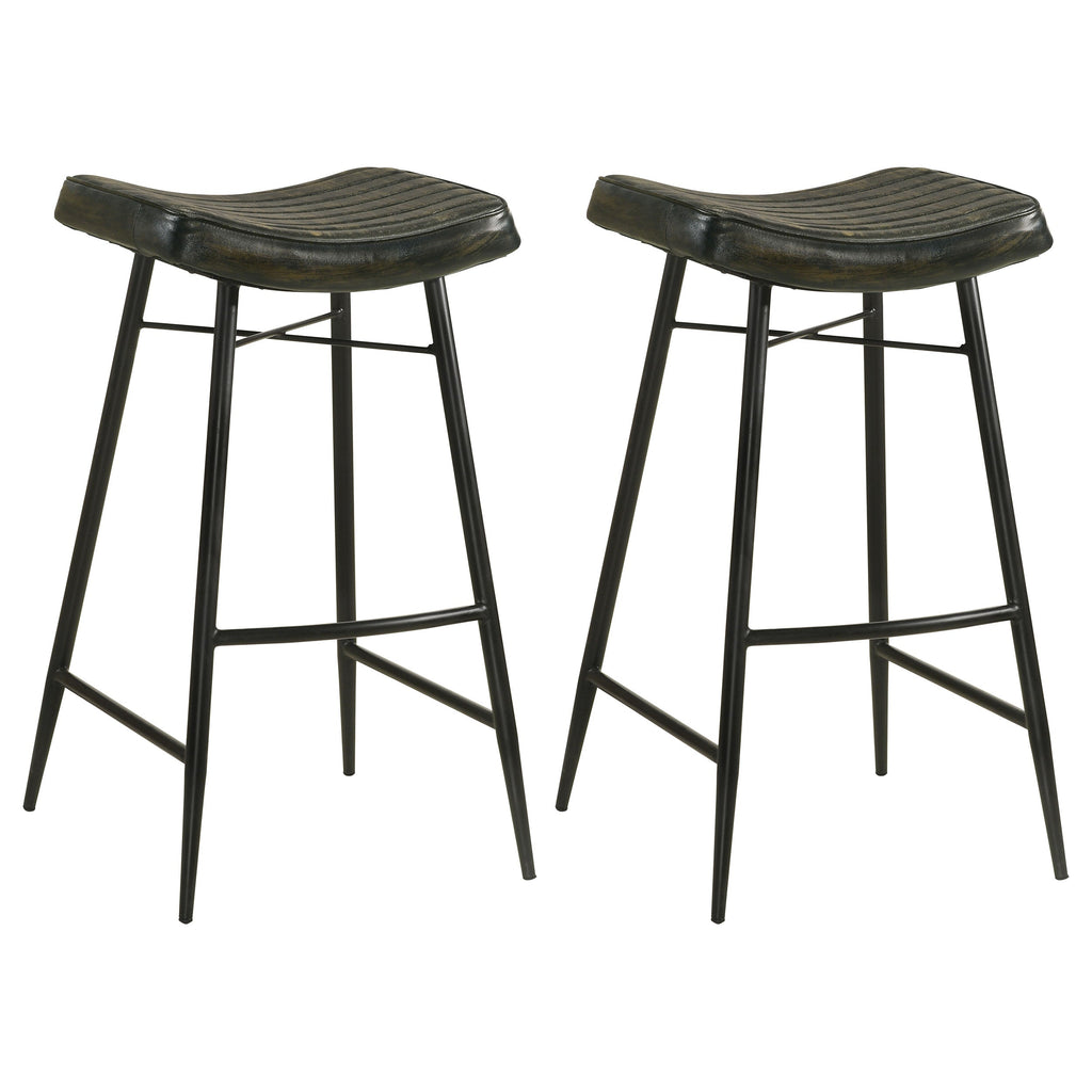 Inject a heavy dose of casual character to your kitchen or bar with the rich antiqued leather upholstery featured on a classic backless stool. Its gently curved seat cradles you in comfort, with channel tufting that adds texture and compelling style. A durable metal base delivers stability for all your seating needs, from a quick cup of coffee in the morning to a leisurely dinner catching up with your favorite person. Flared legs define its silhouette, with an X-cross brace just under the seat adding visual interest and depth. Gently curved footrests and built into the base, perfect for support and style for the whole family.