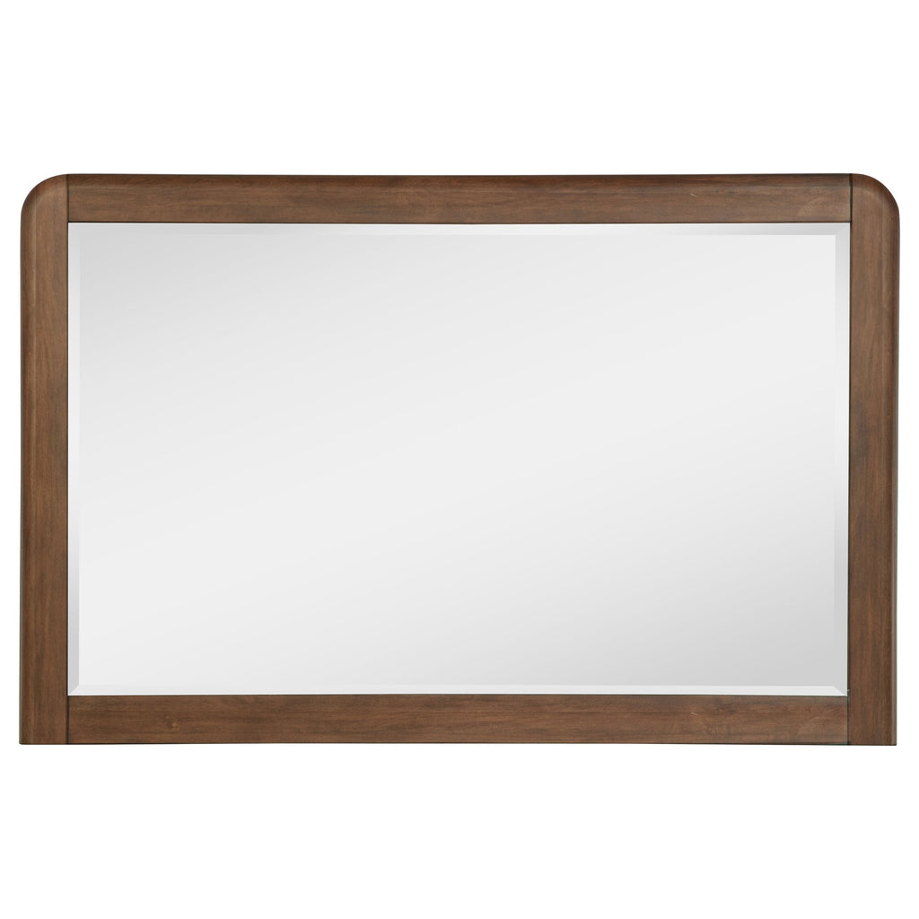 Upgrade your bedroom ambiance with the fresh, clean-lined style of this modern bedroom set. Designed with a walnut wood finish, the set centers on a streamlined bed that boasts an upholstered headboard with rounded corners. Beige upholstery and plush padding deliver understated style and impeccable comfort for evening lounging. The set includes storage pieces with ample drawer space for clothing and linens, and pieces are complete with both cedar, and felt lining in top drawers to protect valuables and delicates. Fingertip pulls add a touch of dimensionality to the front of each piece, while engineered wood construction delivers reliable durability.