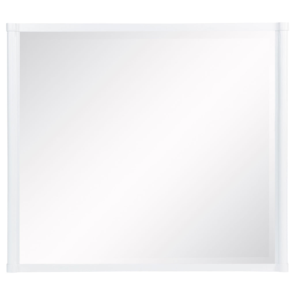 This bedroom set combines soft curvature and linear polish in a clean modern silhouette. Each piece features elongated brushed nickel pulls and subtle vertical tube accents that frame smooth white surfaces. The bed softens the look with a light grey upholstered headboard and footboard, adding contrast and comfort. Built from solid rubberwood, engineered wood, and laminate veneer, this set balances elegance with practical everyday function.