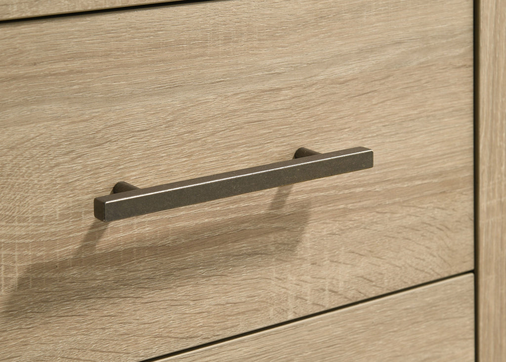 A graceful blend of form and function, this four-drawer chest brings refined charm to any bedroom. Its clean silhouette is softened by a warm light oak finish, while antique nickel hardware adds a touch of elegance. Thoughtfully crafted from engineered wood with a durable laminate veneer, it balances beauty with resilience. Smooth-gliding drawers feature English dovetail joinery, offering a timeless solution for storing clothing and daily essentials.