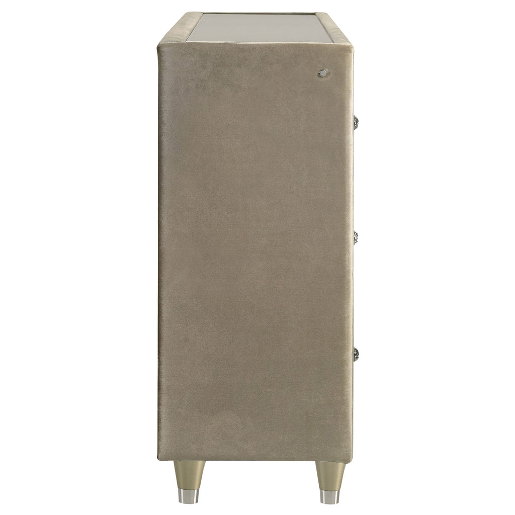Infuse your space with cozy glamour in this eight-drawer flame box dresser, richly upholstered in ivory and camel velvet. A built-in LED flame visualizer is framed by clear tempered glass and acrylic details, while crystal knobs and quilted velvet drawers shine with elegance. LED case lighting and a wireless remote enhance function, while brown felt-lined top drawers, dovetail joints, and heavy-duty glides provide strength and finesse atop solid rubberwood legs.