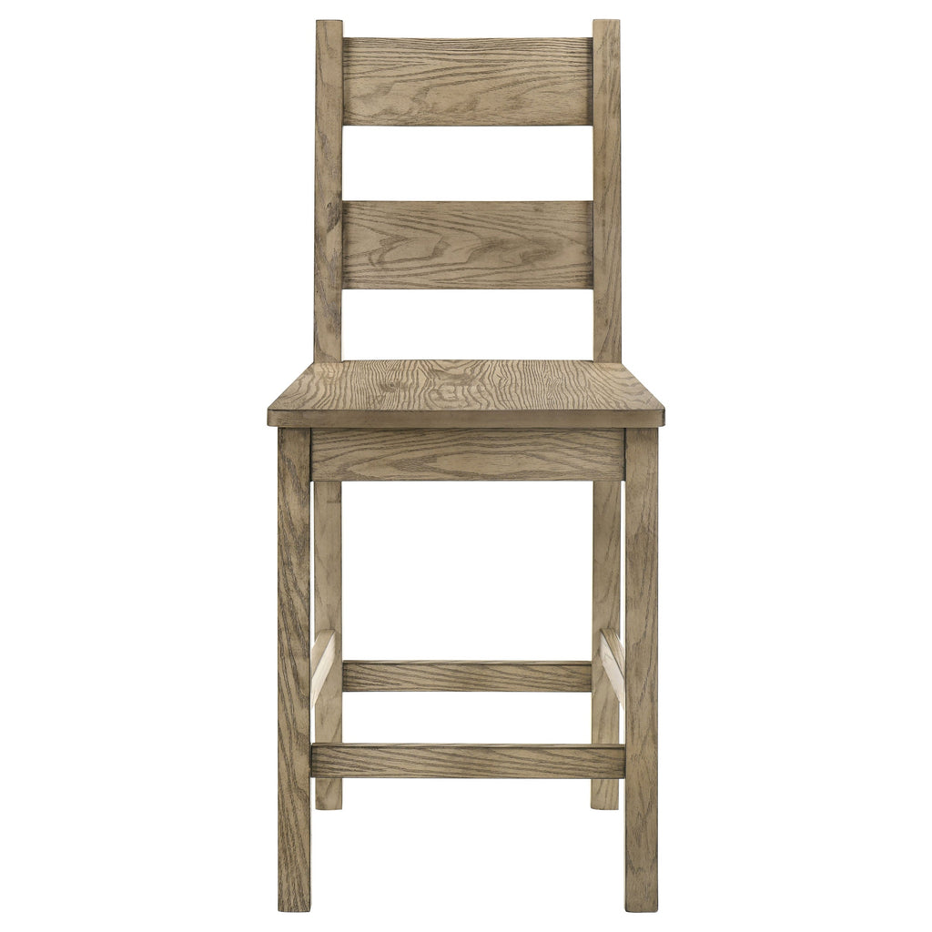 Blending rustic soul with intimate scale, this five-piece counter height set turns every meal into a gathering. A square table anchors the group with bold legs and vineyard oak grain, while four ladder-back chairs cradle comfort with their sculpted wood seats. Built from solid rubberwood, its raised format creates a welcoming rhythm for everyday dining in smaller spaces filled with warmth and connection.