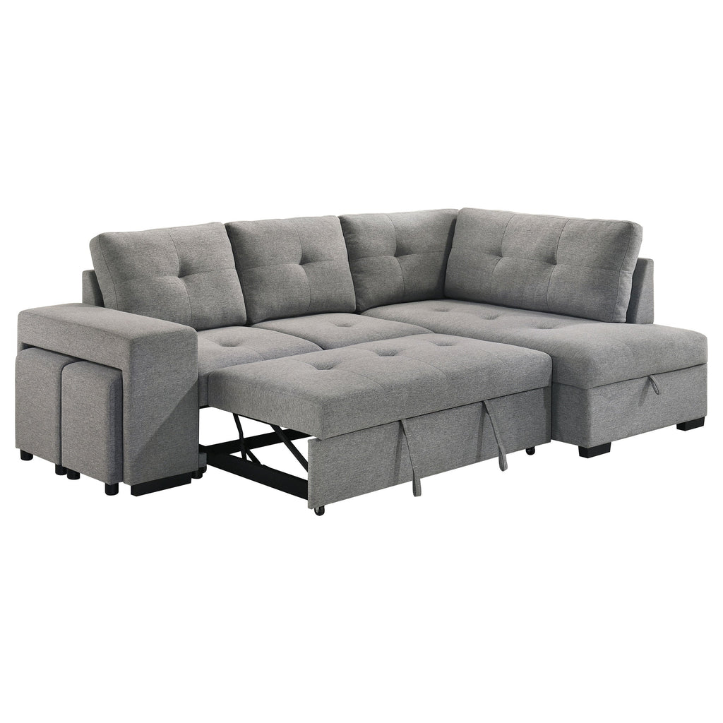 Effortlessly blending beauty and utility, this sleeper sectional invites you to unwind in tailored comfort. Draped in soft grey fabric, its tufted cushions exude quiet elegance, while the generous silhouette offers space to stretch, gather, or dream. Two upholstered stools nest neatly within the armrest, ready for extra seating in an instant. A pull-out bed welcomes overnight guests, and the chaise conceals spacious hidden storageÑperfectly designed for life lived beautifully.