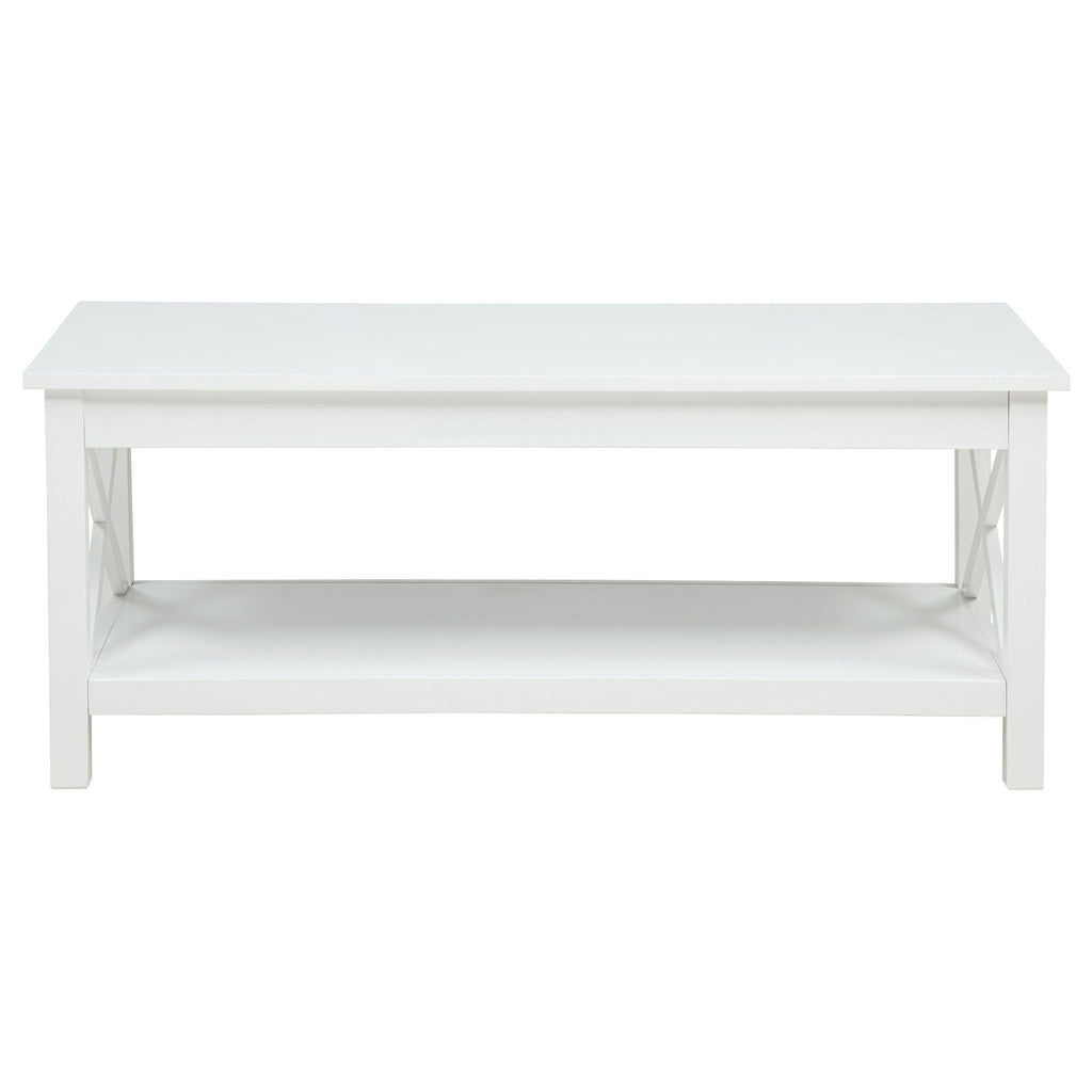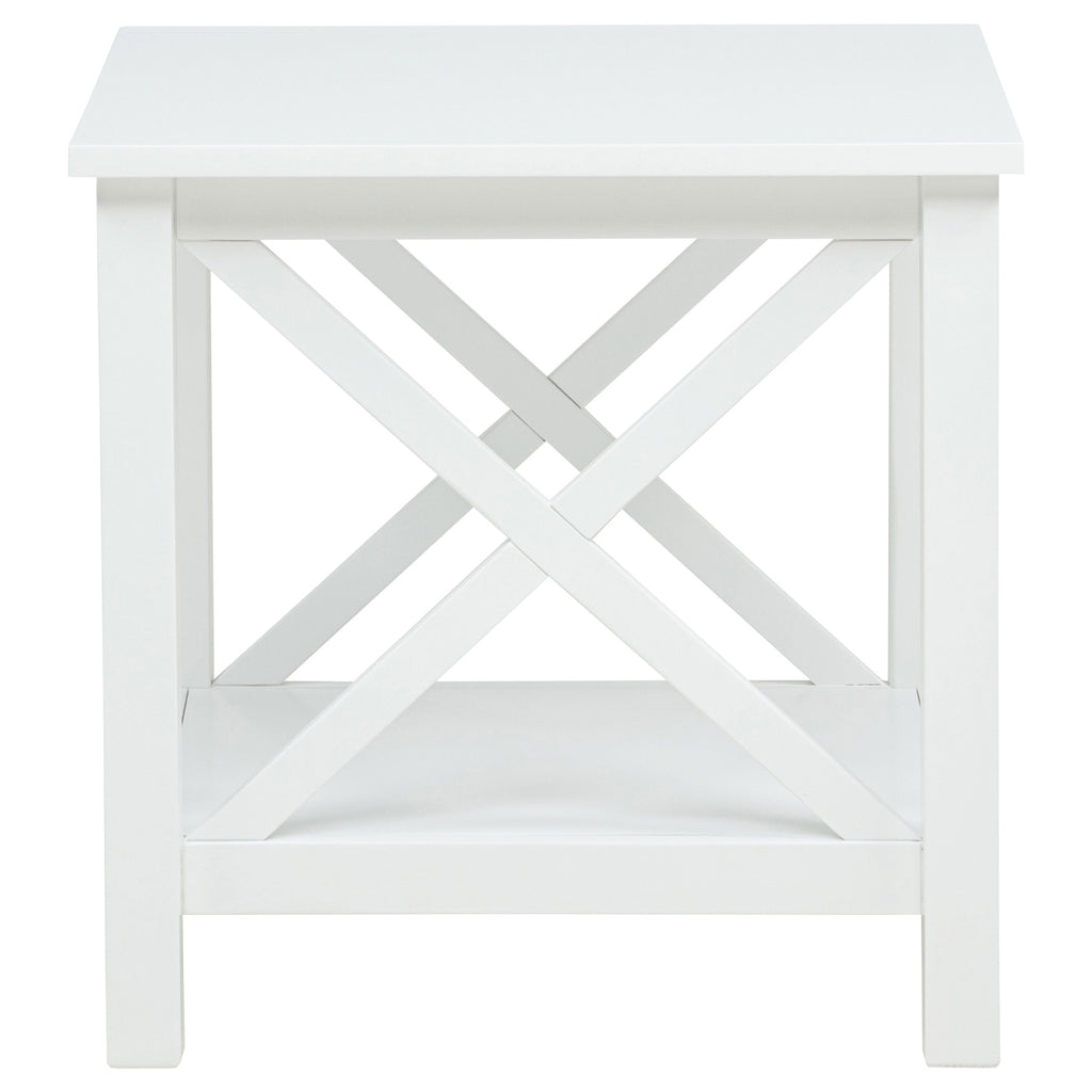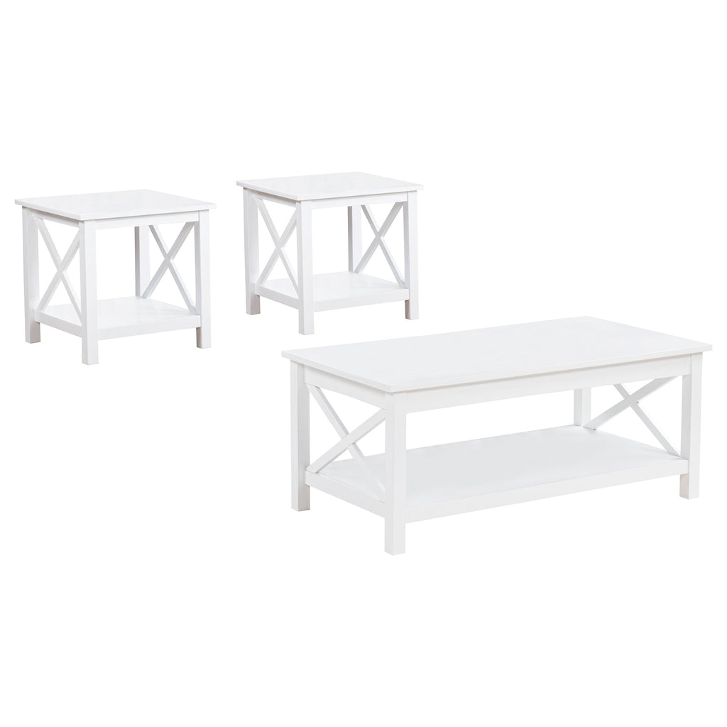 Blending clean lines with classic charm, this occasional table set offers timeless appeal with practical purpose. The lift-top coffee table features hidden storage and a rising surface for flexible use, while the matching end table provides open shelving and farmhouse-inspired X-frame sides. Finished in bright white and crafted from pine and engineered wood, this living room set brings fresh energy and functional design to everyday moments.