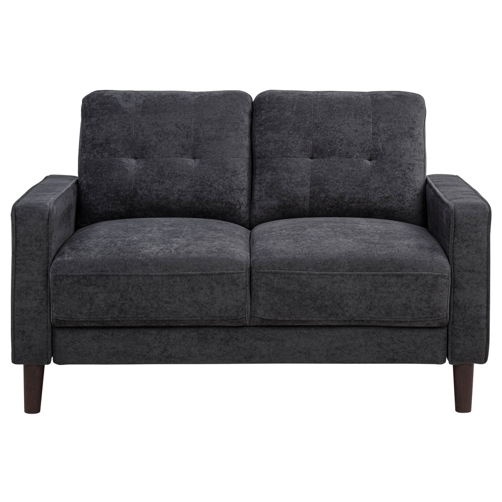 Simple yet thoughtfully detailed, this sofa set brings comfort and structure to compact spaces. Slim track arms with cord welt trim frame grid-tufted back cushions, while soft, textured upholstery creates a relaxed and inviting feel. Pocket coil seating offers lasting support, and tapered round legs provide a lifted foundation. Tailored and timeless, this collection is ideal for studio living or any room in need of space-conscious comfort.