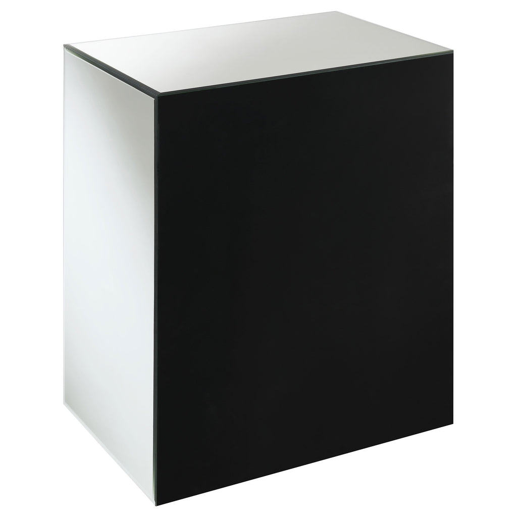 Sleek reflective surfaces elevate the modern glam look of this contemporary accent table. Covered entirely in mirror trim and paneling, this magnificently modern accent table blends into its surroundings. A single top drawer opens up to spacious interior storage. Adorned with a glimmering crystal knob, this accent table offers a wonderful polished and sparkling element of surprise for bedrooms and living rooms alike. A bottom shelf below even allows you to display decor, books, or even keep a throw basket.