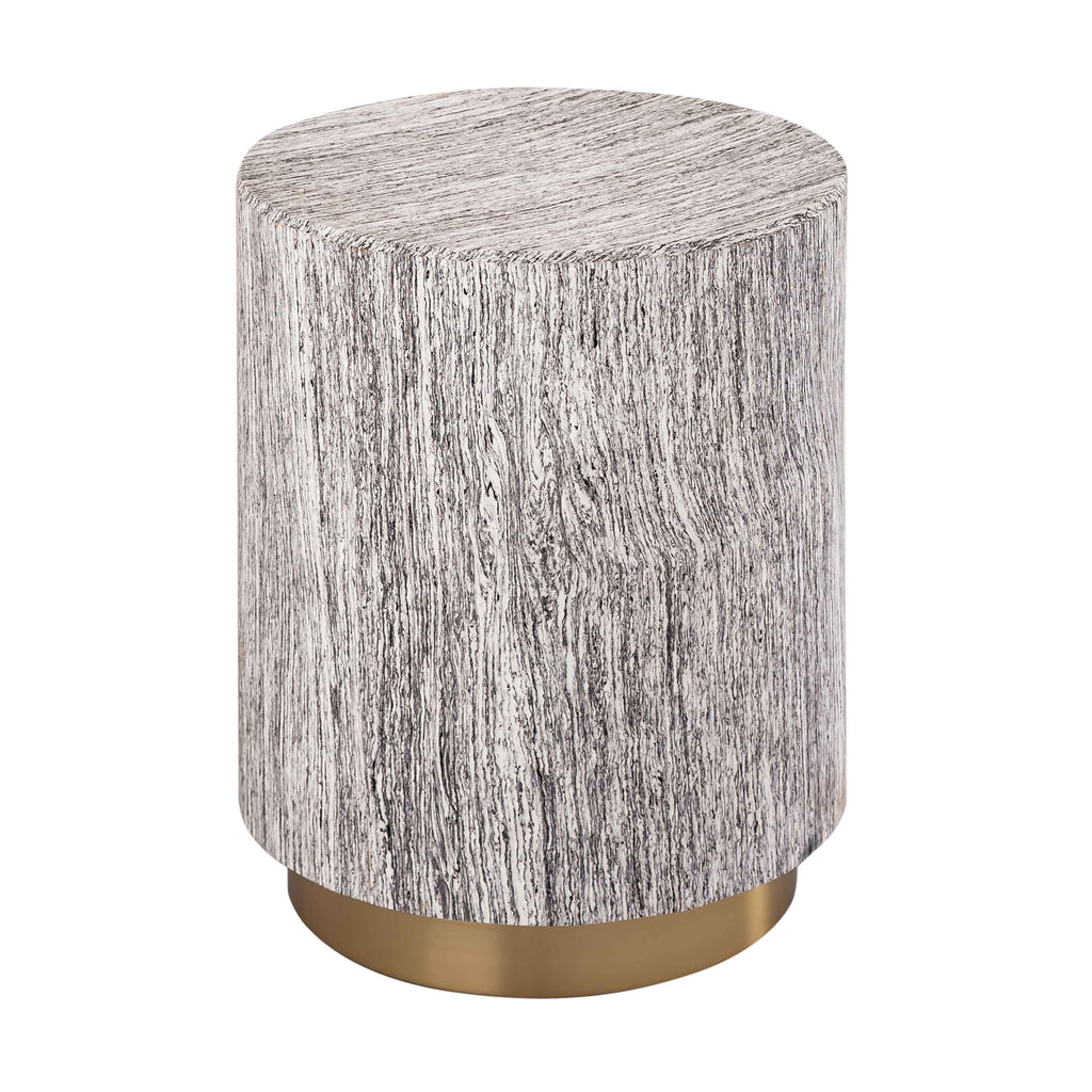 Inspired by petrified logs and singular designs, the Dahlia table is a warm and homey accent piece. This table features a cylindrical body supported by a gold base, and neutral tones perfect for any setting.
