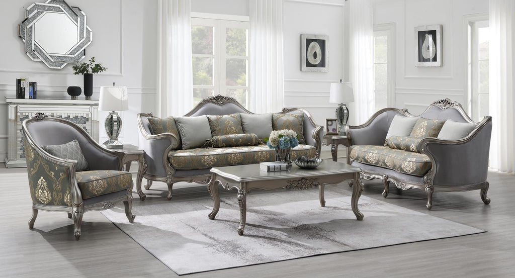 Hardwood Constructed Frame, Luxuries Fabric, Pillow Back, Hand Carved Traditional Accents, Champagne Silver Seat Cushions, High Density Cushions, Multi-Accent Pillow, Champagne Silver Color Trim Accents, Coordinate with T198 Collection